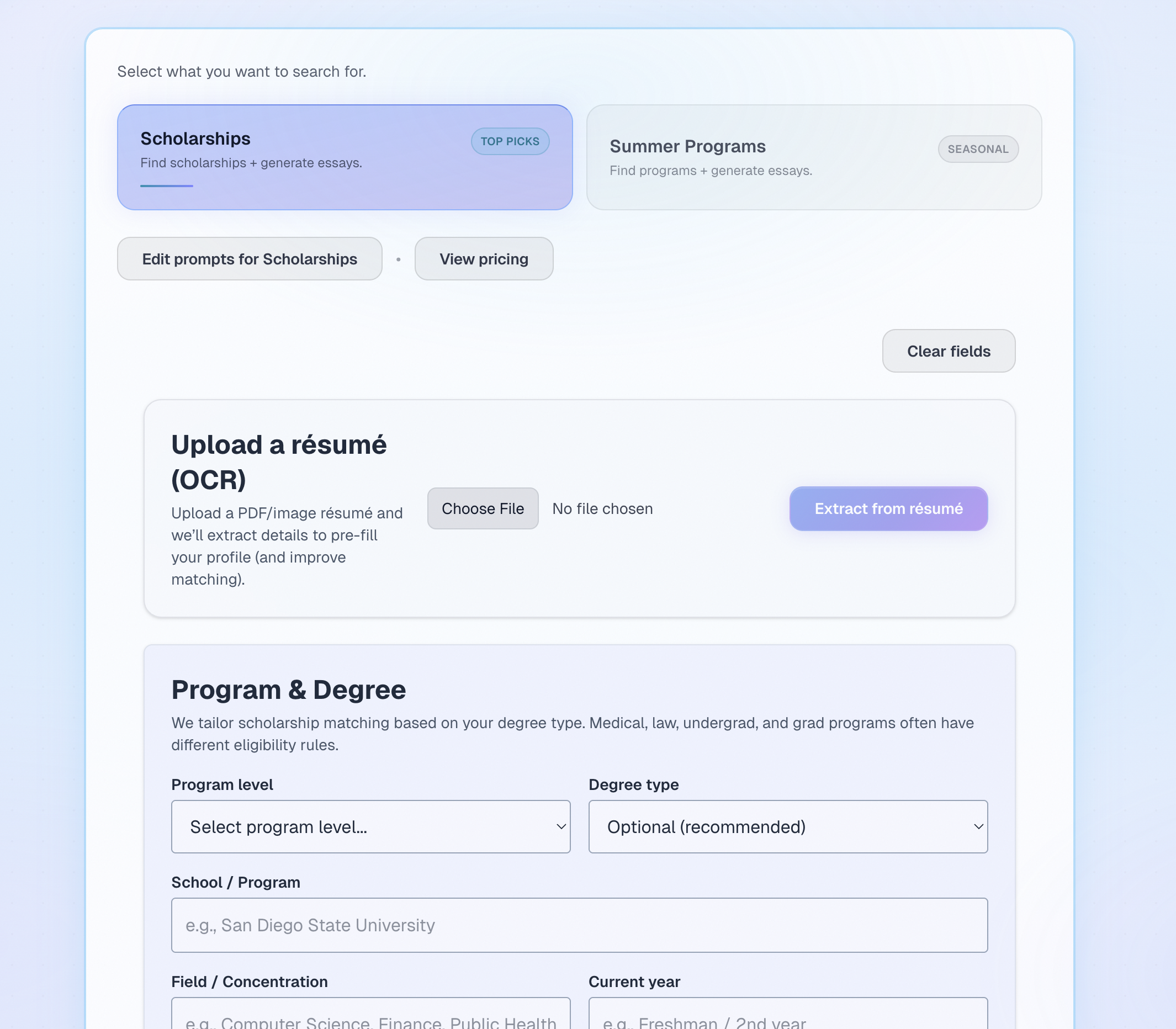 Create your profile once. Use credits to find scholarships you qualify for. We extract prompts, deadlines, and word limits from messy pages — then generate ready-to-edit drafts.
