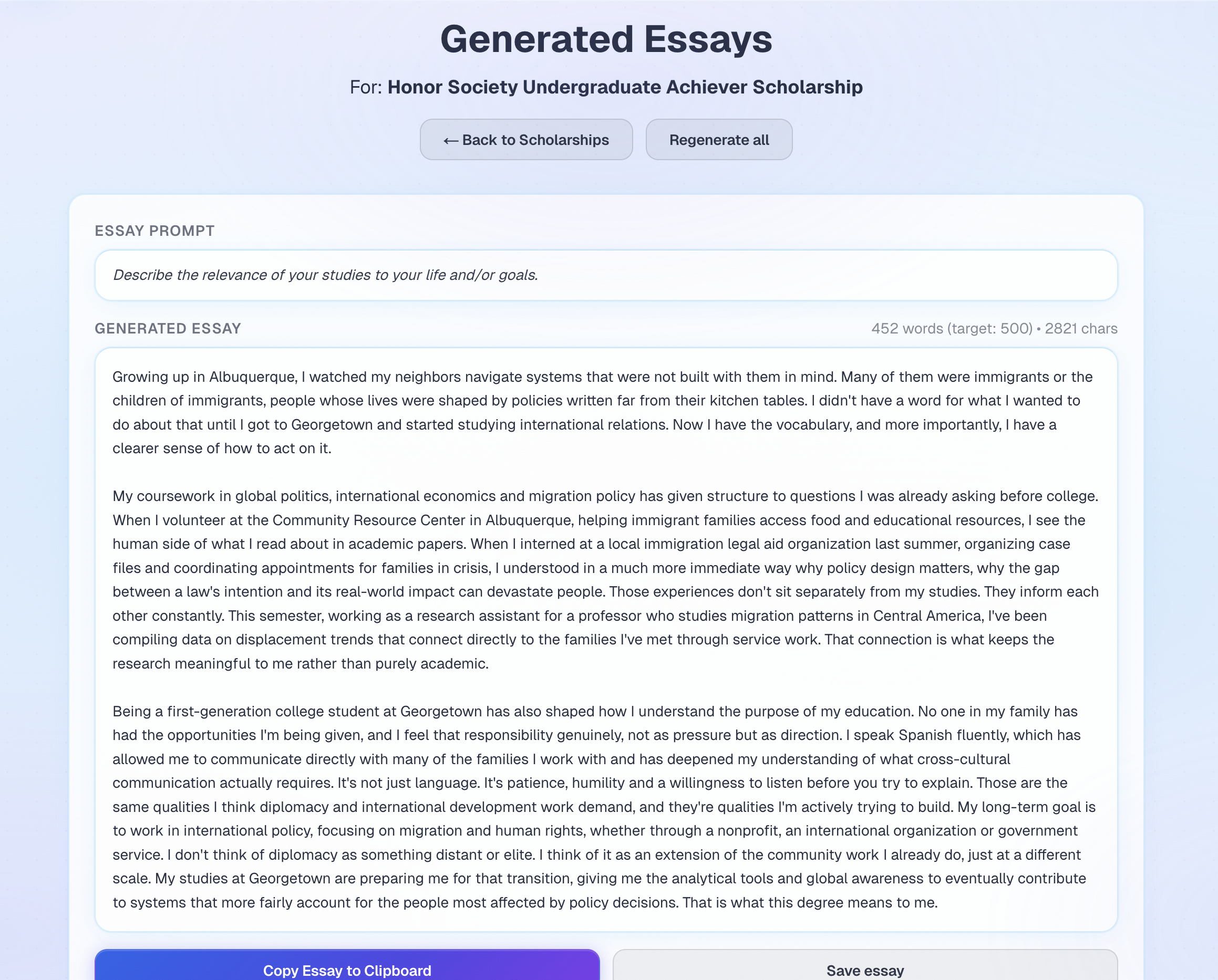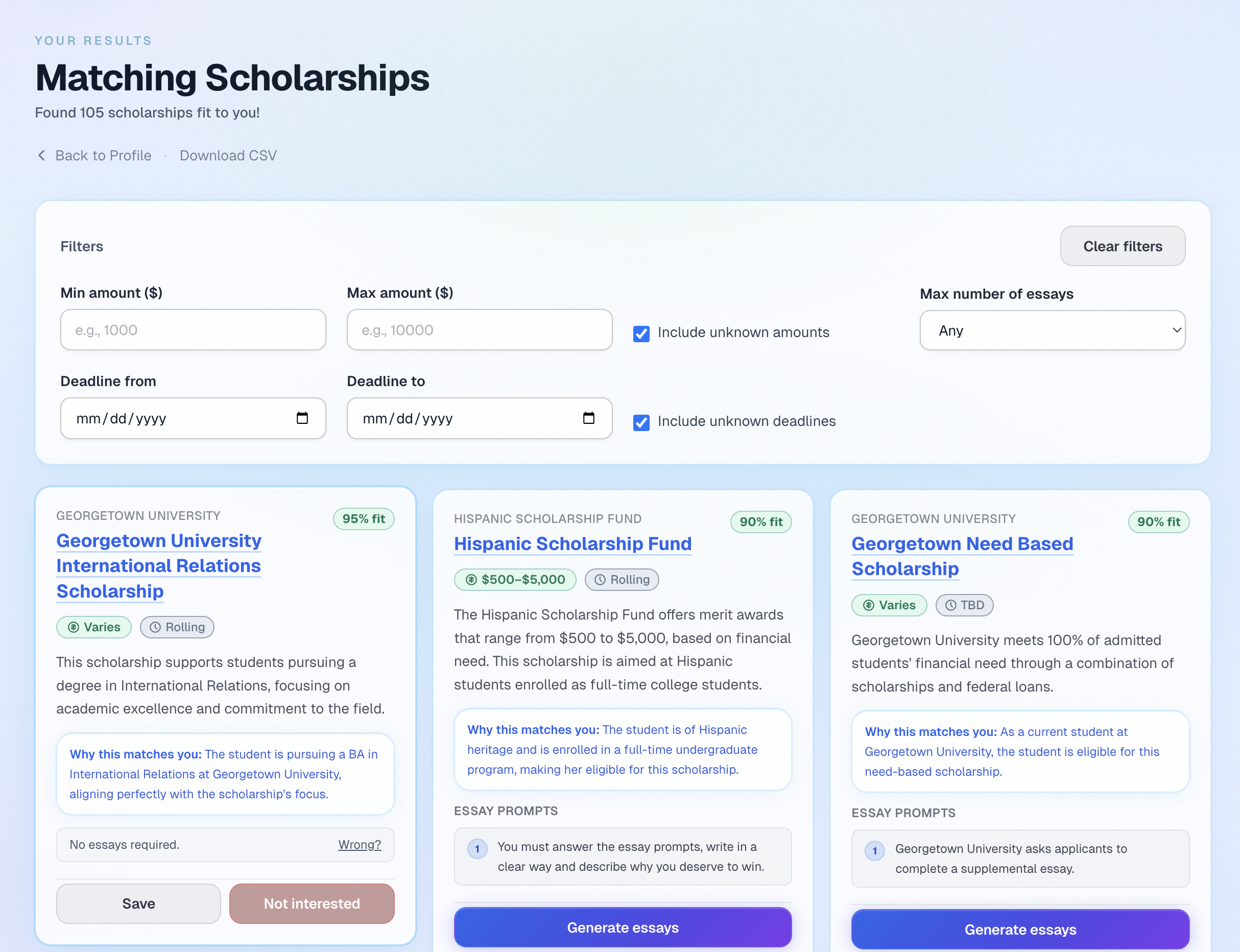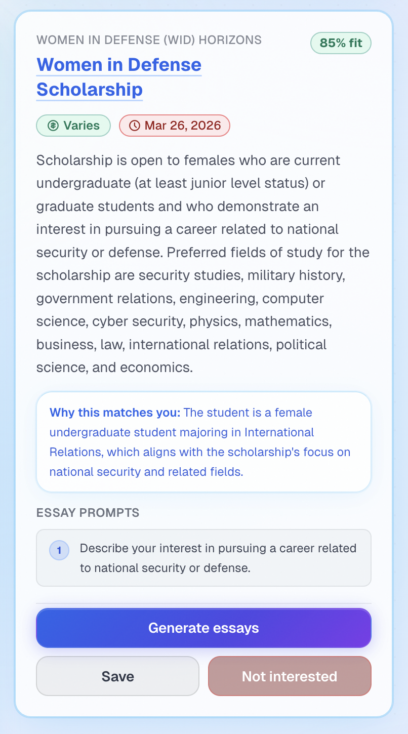 Create your profile once. Use credits to find scholarships you qualify for. We extract prompts, deadlines, and word limits from messy pages — then generate ready-to-edit drafts.